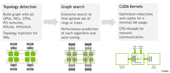 NCCL主要做几件事:探测计算节点的网络设备和拓扑结构,使用算法自动调优选择一个最优的通信方式。